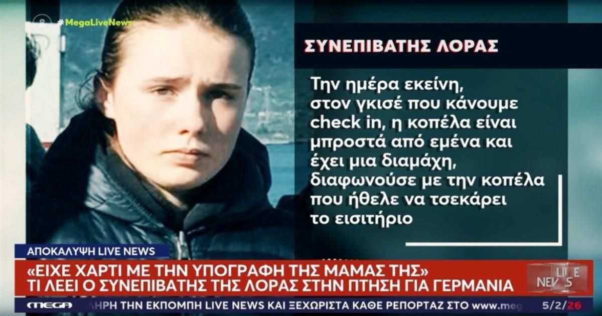 Υπενθυμίζεται ότι η Λόρα, αφού βρέθηκε στην Αθήνα την 8η Ιανουαρίου, προμηθεύτηκε με ψευδώνυμο και κρυπτογραφημένο email ένα αεροπορικό εισιτήριο προς Φρανκφούρτη με την εταιρεία Lufthansa. Η αεροπορική απάντησε σε αιτήματα των αρχών και αποκάλυψε ότι η Λόρα επιβιβάστηκε μόνη στο αεροσκάφος. Μάλιστα, συνεπιβάτης της στην πτήση, αποκάλυψε, μιλώντας στο «Live News» ότι η 16χρονη είχε υπογεγραμμένο χαρτί από τη μητέρα της.