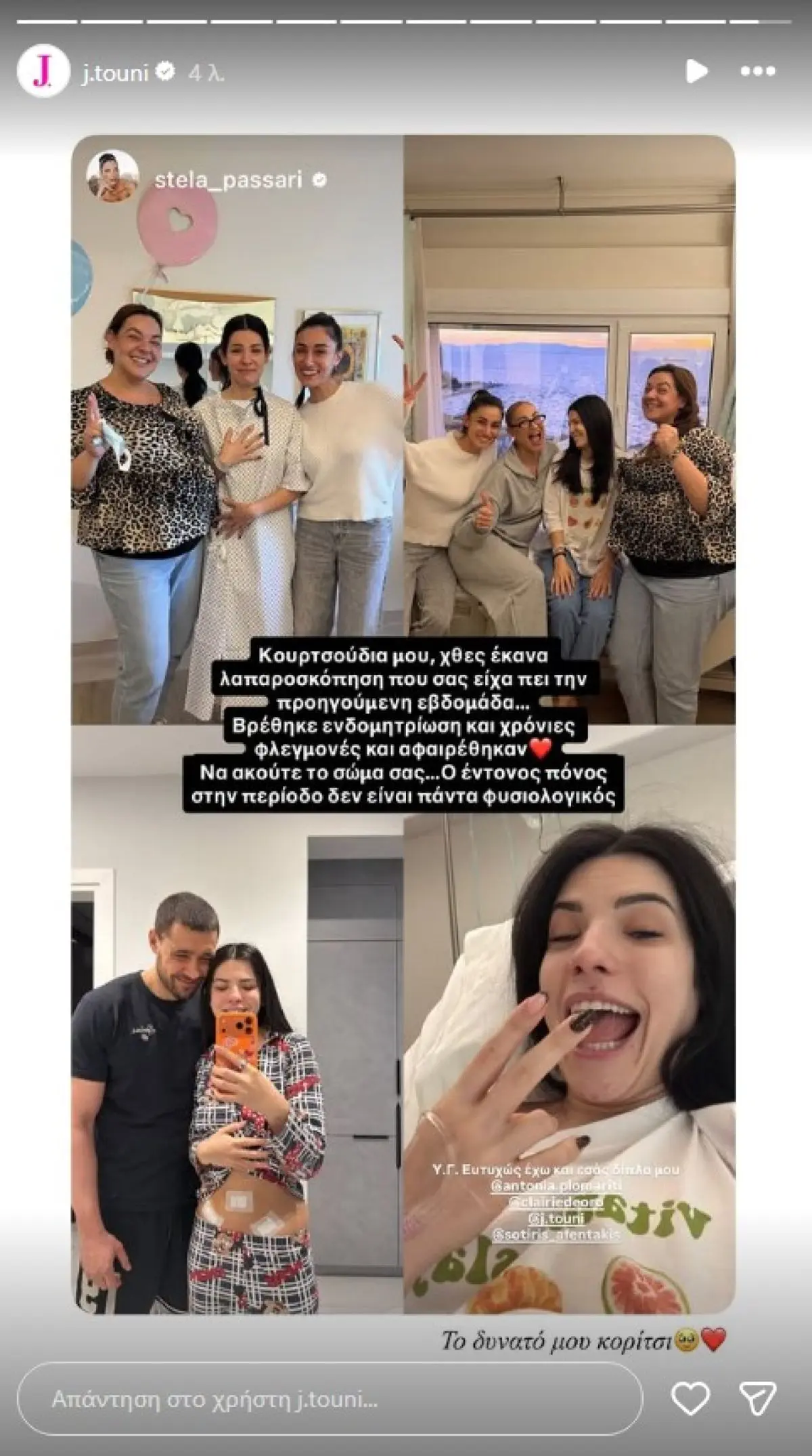 Όπως έγινε γνωστό μέσα από αναρτήσεις στα social media, η Στέλα Πασάρη προχώρησε σε λαπαροσκόπηση, έπειτα από έντονους πόνους που αντιμετώπιζε εδώ και καιρό. Κατά τη διάρκεια της επέμβασης, οι γιατροί εντόπισαν ενδομητρίωση και χρόνιες φλεγμονές, οι οποίες και αφαιρέθηκαν. Η ίδια, με ειλικρίνεια και θάρρος, θέλησε να μοιραστεί την εμπειρία της, στέλνοντας ένα ηχηρό μήνυμα προς όλες τις γυναίκες: να ακούν το σώμα τους και να μην αγνοούν τον έντονο πόνο, ειδικά όταν αυτός επαναλαμβάνεται.