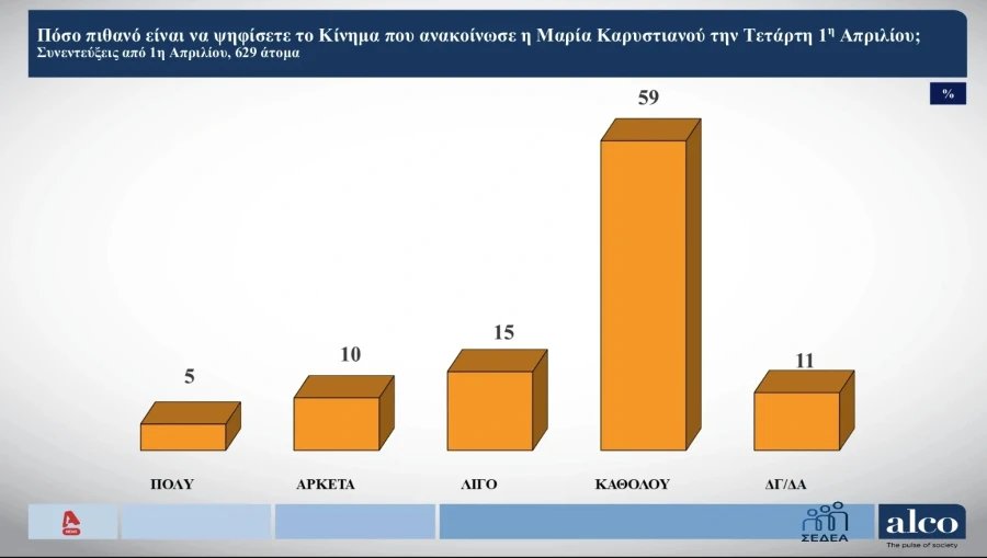 Στο πεδίο της αντιπολίτευσης, το ενδιαφέρον της κοινής γνώμης στρέφεται στις επικείμενες πρωτοβουλίες της Μαρίας Καρυστιανού. Ένα ποσοστό που αθροιστικά φθάνει στο 15% εμφανίζει η Μαρία Καρυστιανού στο ερώτημα πόσο πιθανό είναι να ψηφίσετε το κόμμα που ανακοίνωσε την προηγούμενη Τετάρτη. «Λίγο» απαντά το 15% ενώ το 59% λέει «καθόλου».