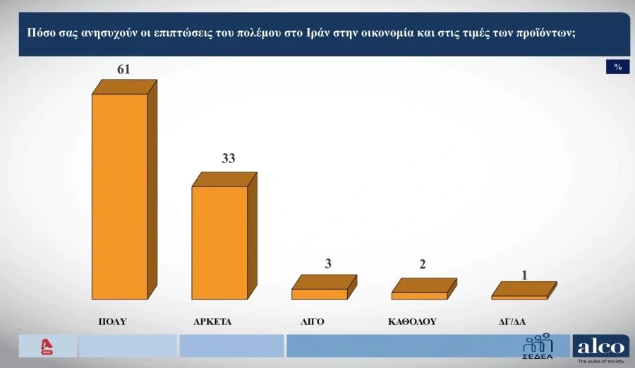 Eννέα στους 10 ερωτηθέντες δεν κρύβουν την ανησυχία τους για τις επιπτώσεις του πολέμου στο Ιράν στην οικονομία και στις τιμές των προϊόντων. Το 61% απαντά «πολύ» και το 33% «αρκετά».