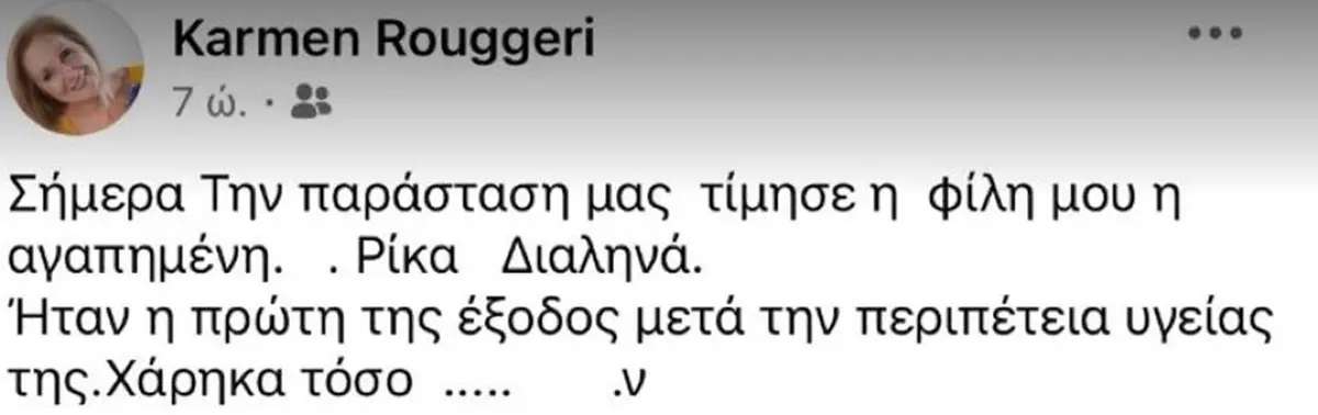 «Σήμερα την παράστασή μας τίμησε η φίλη μου η αγαπημένη, Ρίκα Διαλυνά. Ήταν η πρώτη έξοδος μετά την περιπέτεια υγείας της. Χάρηκα τόσο», έγραψε χαρακτηριστικά στην ανάρτησή της, με την Ρίκα Διαλυνά να ποζάρει χαμογελαστή, φορώντας ένα μαύρο κοστούμι.