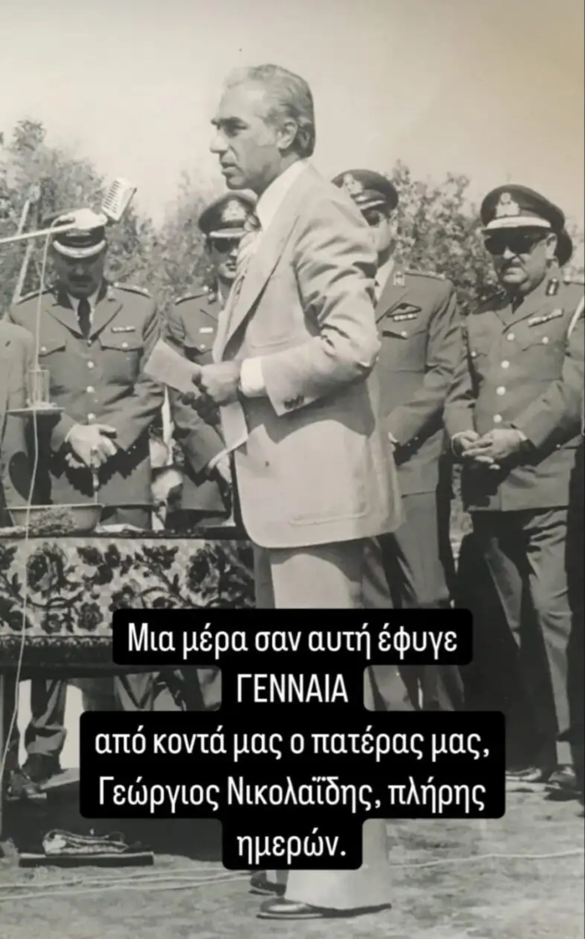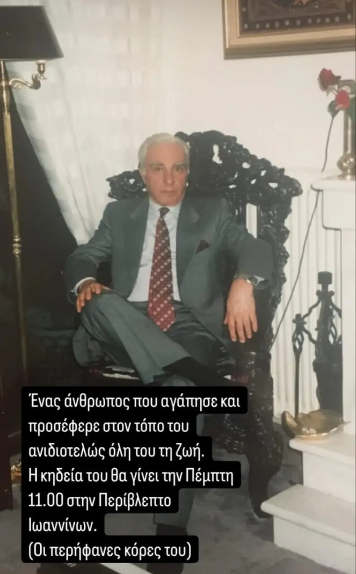 Η ίδια είχε γράψει: «Μια ημέρα σαν αυτή έφυγε γενναία από κοντά μας ο πατέρας μας, Γεώργιος Νικολαΐδης πλήρης ημερών. Ένας άνθρωπος που αγάπησε και προσέφερε στον τόπο του ανιδιοτελώς όλη του τη ζωή. Η κηδεία του θα γίνει την Πέμπτη στην Περίβλεπτο Ιωαννίνων (Οι περήφανες κόρες του)».