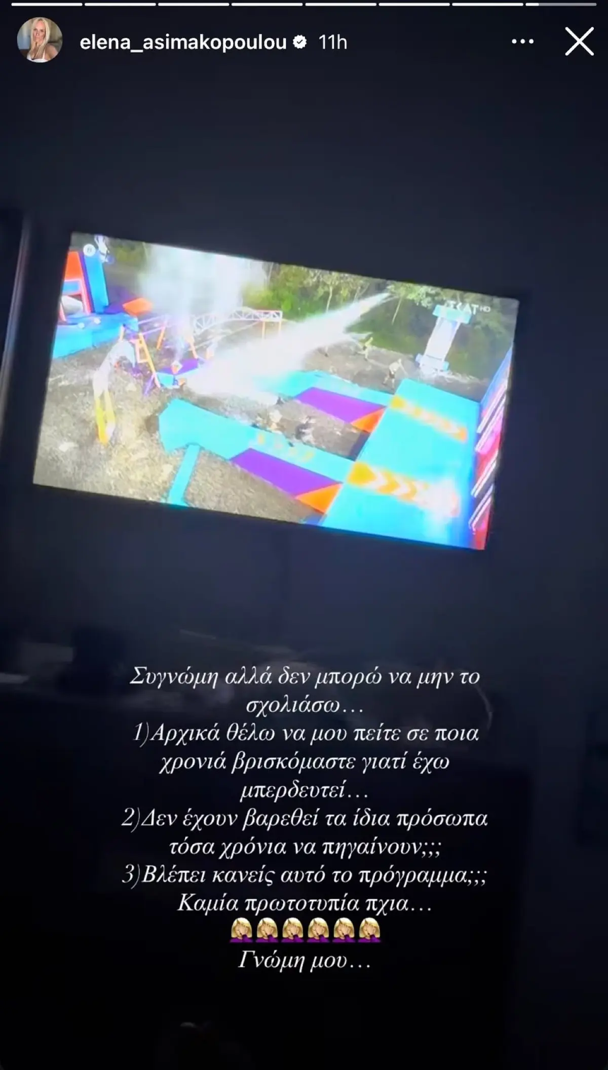 «Συγνώμη αλλά δεν μπορώ να μην το σχολιάσω… Αρχικά θέλω να μου πείτε σε ποια χρονιά βρισκόμαστε γιατί έχω μπερδευτεί… Δεν έχουν βαρεθεί τα ίδια πρόσωπα τόσα χρόνια να πηγαίνουν;;; Βλέπει κανείς αυτό το πρόγραμμα;;; Καμία πρωτοτυπία πια… ♀️♀️♀️♀️♀️♀️ Γνώμη μου…», έγραψε χαρακτηριστικά.